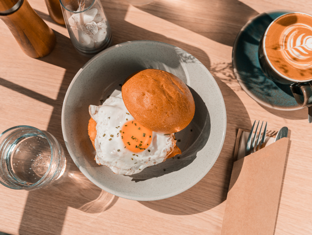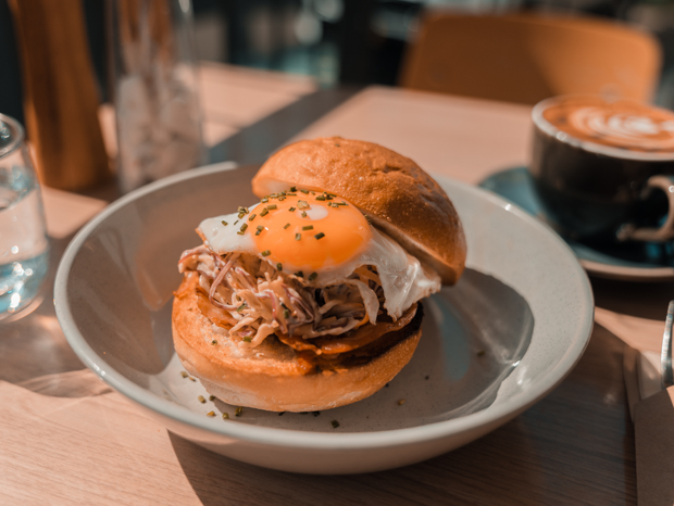 Rindless eye bacon, free range egg, yuzu sesame coleslaw on burger roll