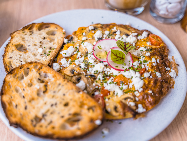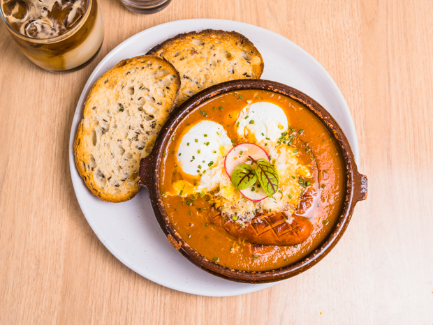 Free range poached eggs, chorizo, house made pomodoro sauce & soy linseed sourdough topped with pecorino cheese