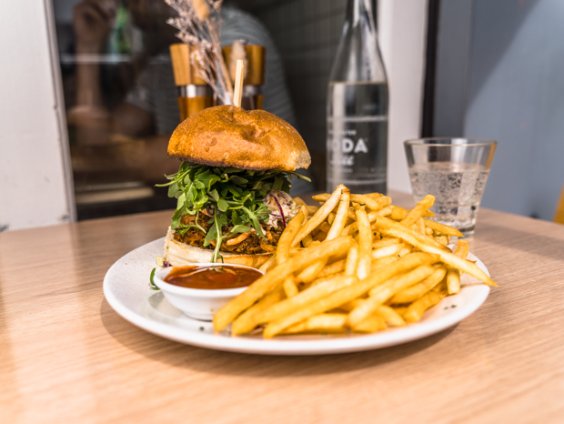 Smoked pulled pork, coleslaw, rocket on burger roll + chips