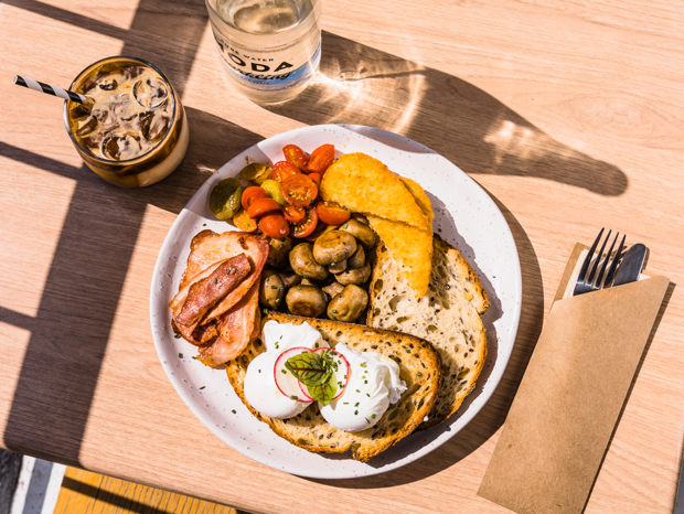 Eggs cooked your way, bacon, sauteed mushroom, hash brown, grilled tomatoes & soy linseed sourdough