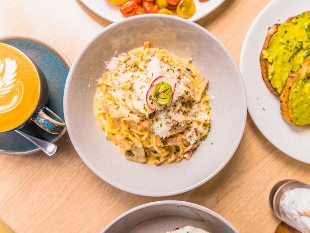 Spaghetti, bacon, mushroom, cream & pecorino cheese Spicy: none | mild | hot
