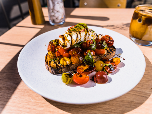 Cherry tomato, bocconcini, basil, honey, hint of garlic. On soy linseed sourdough toast with balsamic glaze